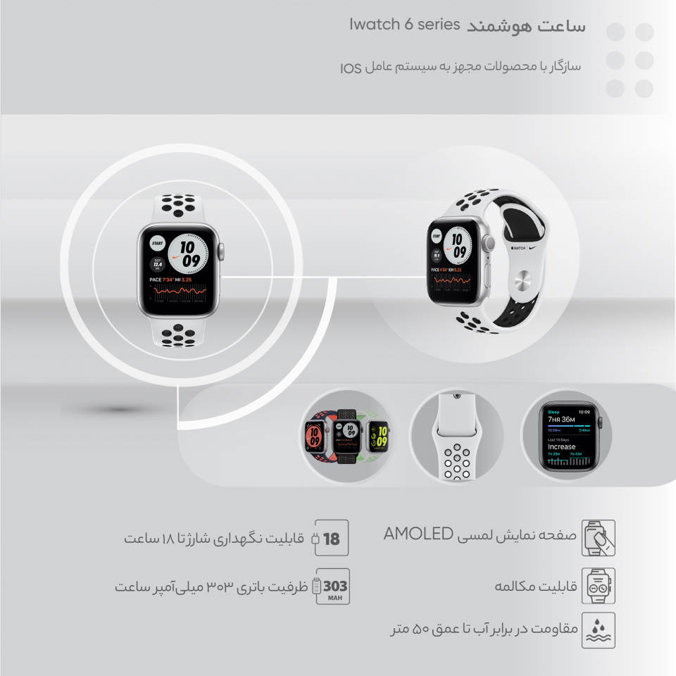 خرید حضوریاپل واچ سری ۶ مدل 44mm Space Gray Aluminum Case with Nike Sport Band از ساعتهای هوشمند زیبای برند اپل است.این اپلواچ ۴۴ میلیمتری ویژگیهای خاصی دارد که میتوان از میان آنها به مقاومت در برابر آب تا عمق ۵۰ متری اشاره کرد. مقاومت در برابر آب این مدل موجب میشود، کاربر هنگام بارش باران یا شستوشوی دست، بدون نگرانی از این گجت استفاده کند، همچنین قادر به استفاده از آن برای برخی ورزشهای آبی (نظیر شنا در آبهای کمعمق و کوتاهمدت) باشد..اپل واچ سری ۶ از تراشه S6 بهره میبرد که بنابر گفتههای کارشناسان اپل تا ۲.۵ برابر سرعت بیشتری نسبت به اپل واچ سری ۵ خواهد داشت.سنسورهای متنوعی که برای پایش فعالیتهای فیزیکی در نظر گرفته شده است مانند سنسور تشخیص مقدار اکسیژن خون، سنسور هشدار تپش قلب نامنظم ، سیستم مسیریابی جیپیاس از قابلیتهای جذاب این مدل از سری جدید اپلواچ هستند. گفتنی است در این سری کمپانی اپل با همکاری شرکت نایکی طرح لوگوی این برند ورزشی را روی بند و صفحه نمایش این محصول حک کرده است که این امر موجب جذابیت بیشتر این ساعت هوشمند در میان ورزشکاران شده است.